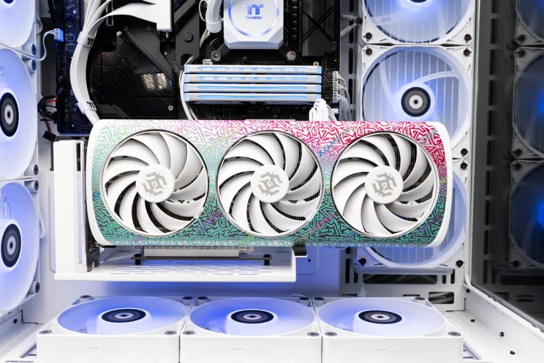 索泰GeForce RTX 50 XGAMING系列显卡以白色为底,大面积撞色,正面花纹设计灵感源自知名艺术家Mr. Doodle,其标志性的密集线条主义风格,在XGAMING上得到精准还原:显卡正面覆盖了数百条线条,看似无序的涂鸦组合营造出充满活力的视觉效果,并通过特殊印刷工艺,使得正面图案在不同光线角度下呈现出独特的视觉效果,进一步增加了显卡的质感和层次感。