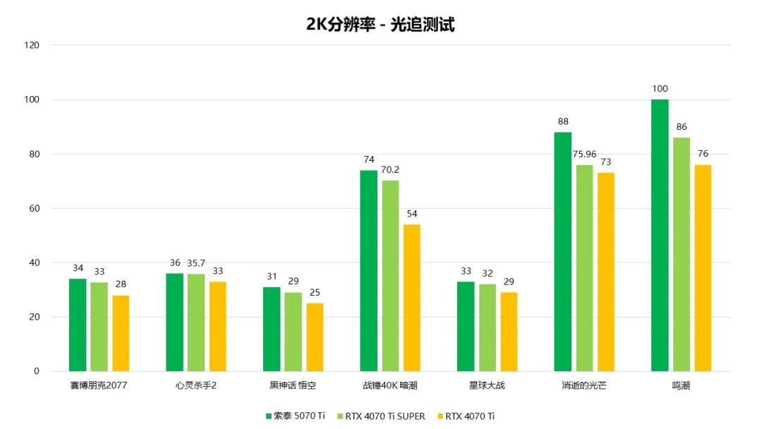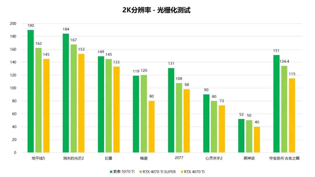 在光栅性能测试中,索泰GeForce RTX 5070 Ti XGAMING的帧数表现平均领先RTX 4070 Ti约28%。在2K分辨率、最高画质的条件下,大部分游戏都可以保持90fps以上的流畅帧数。即便对比RTX 4070 Ti SUPER,RTX 5070 Ti的帧数表现也有约10%的领先幅度,在不考虑DLSS加持的情况下,这个成绩已经是相当优秀了。