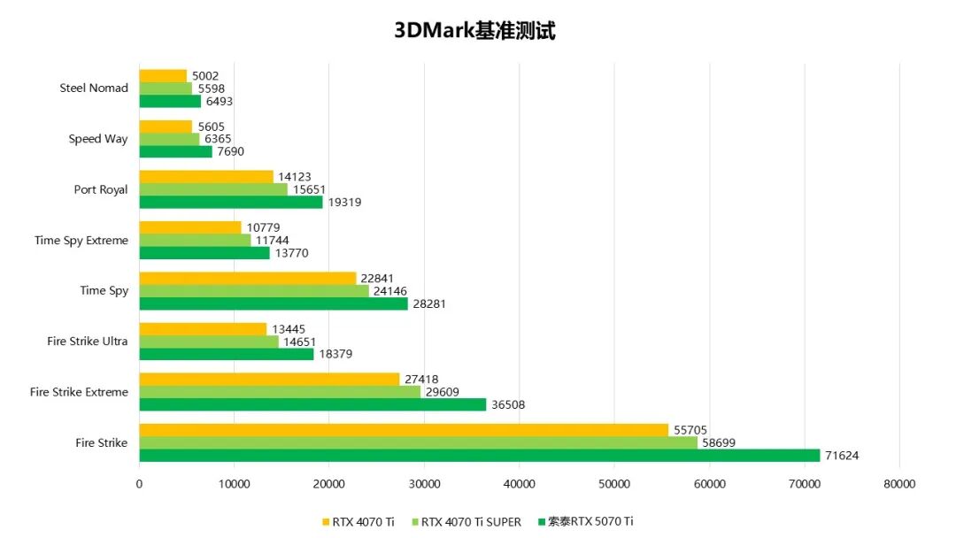 在3DMark基准测试中,索泰GeForce RTX 5070 Ti XGAMING的表现平均领先RTX 4070 Ti约30%。性能差距最小的是Time Spy Extreme项目,领先约27%,性能差距最显著的是Speed Way,领先幅度约为37%。而对比RTX 4070 Ti SUPER,RTX 5070 Ti的平均领先幅度也达到了20%,实现了大幅度的越级领先。