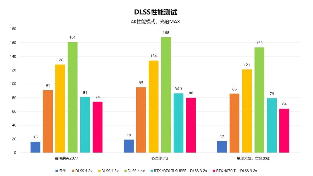 在DLSS的测试中,2x表示只生成1帧,3x为生成2帧,4x为生成3帧。我们直接使用4K分辨率/最高画质/光追极致的测试环境。在素有「帧率倍增器」名号的DLSS 4多帧生成技术加持下,随着补帧倍率的提高,帧数也越来越高,在《赛博朋克2077》中,相比原生帧来说,DLSS 4 4x补帧后的帧数达到了原生帧的10倍!借助 DLSS 4 多帧生成技术,RTX 5070 Ti 的性能相比 RTX 4070 Ti SUPER提高了 2.2 倍,相比RTX 4070 Ti提高了约2倍。