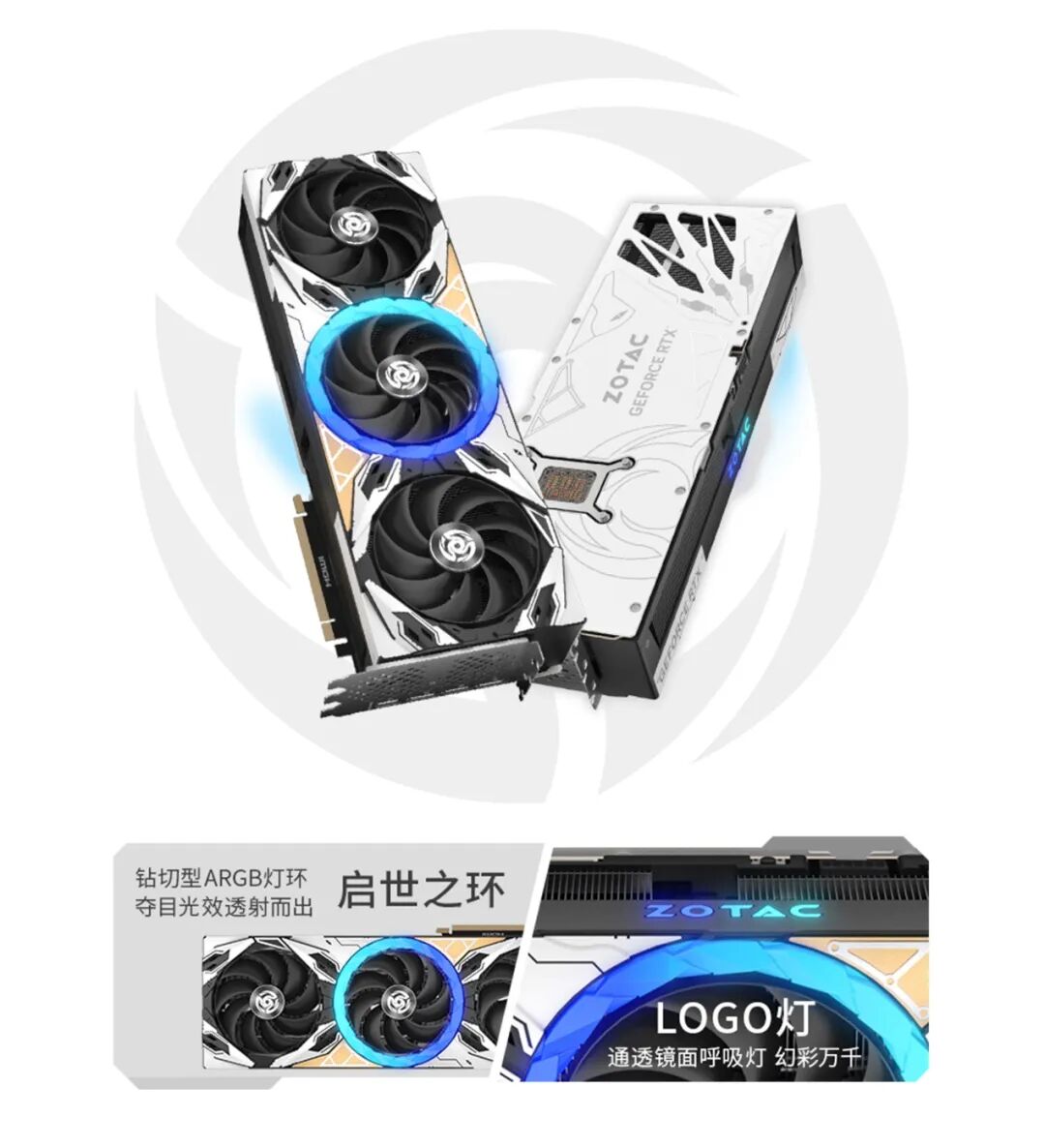 天启 系列显卡的ARGB 信仰灯位于显卡的正面和侧面,侧面的“ZOTAC”品牌LOGO信仰灯,简约而内敛,侧装于机箱时,如星空下的萤火,成为点缀整机的科技浪漫。