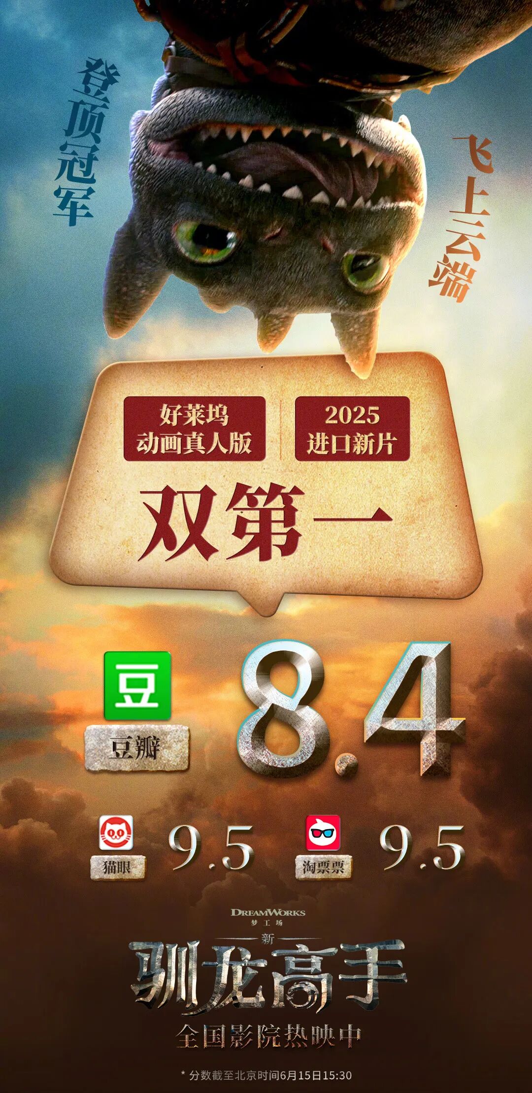影片的品质也获得了观众的认可:《新·驯龙高手》在豆瓣平台获得8.4分的高评价,烂番茄爆米花指数更是达到惊人的98%,CinemaScore口碑民调显示,《新·驯龙高手》获得A级评分。
