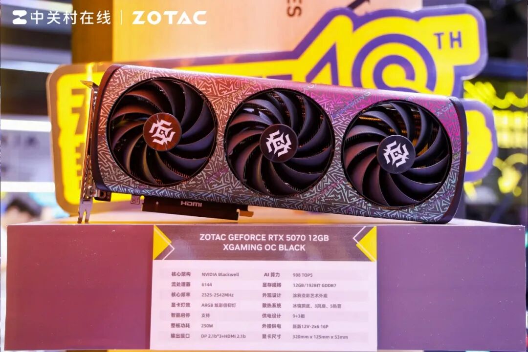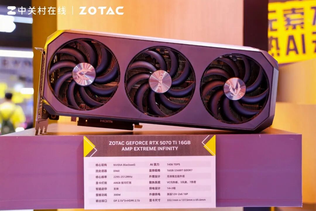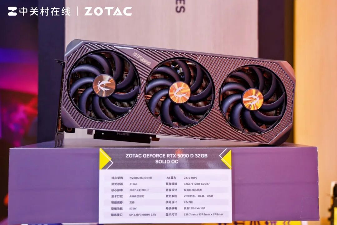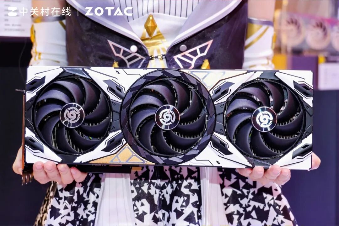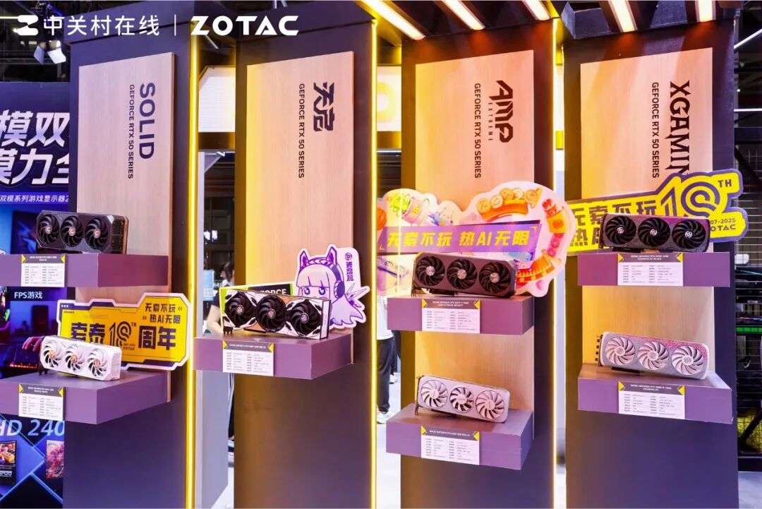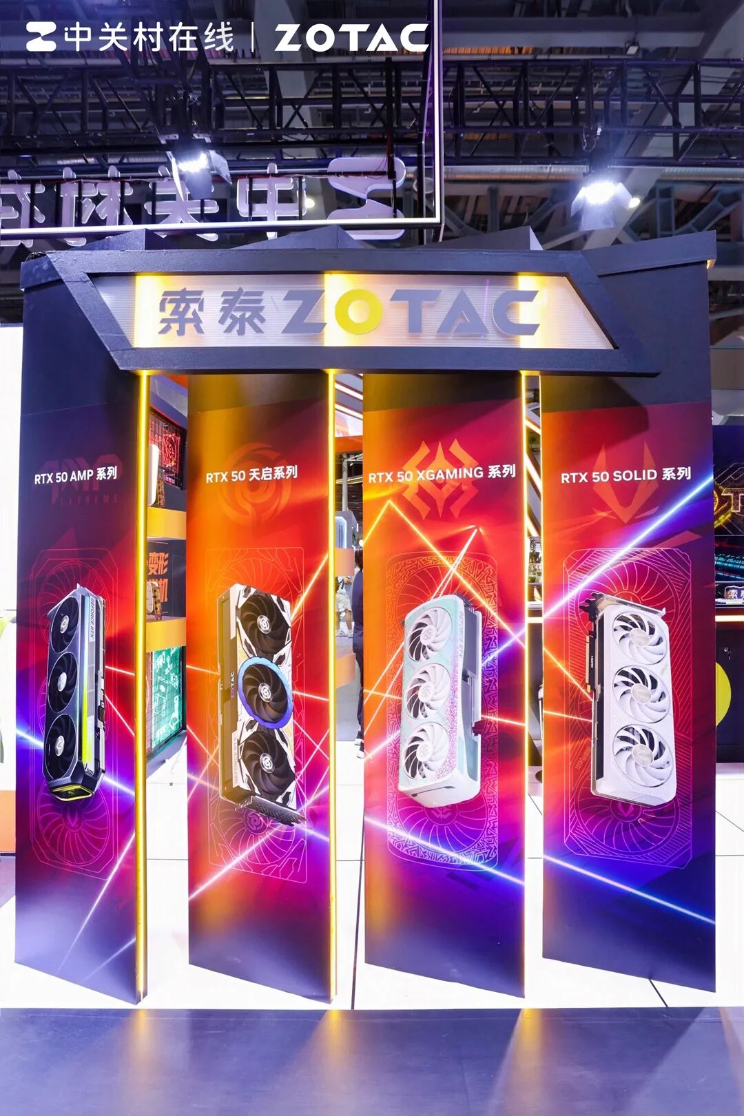 展台中央的显卡矩阵成为最吸睛的焦点,索泰全系列GeForce RTX 50显卡集体亮相: