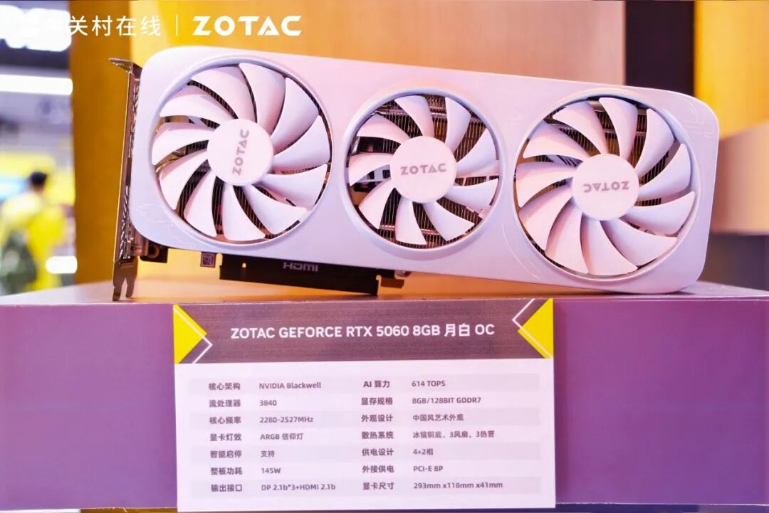 国风雅韵RTX 5060 月白OC:以中国传统色“月白”为设计灵感,融入中式美学设计,轮廓简洁大方,配合特殊工艺打造出显卡雅致温润的外观质感,以古典雅韵诠释AI游戏时代新范式。