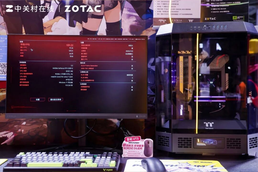Tt The Tower 600:这是全场性能最强的整机,它搭载了索泰 RTX 5090 D SOLID OC 新卡皇,深邃内敛的纯黑配色,简约而沉稳的立体造型,全侧透的立体设计,将机箱内部配件与RGB灯效尽收眼里,赛博科技感跃然于眼前,质感出众,颜值满满,实力担当!