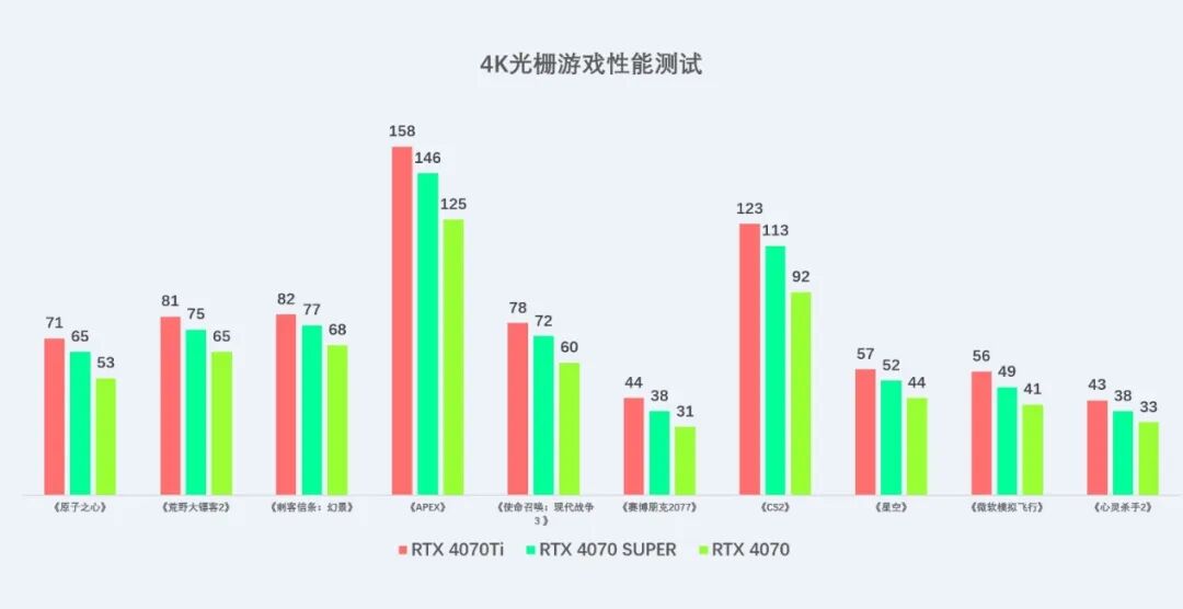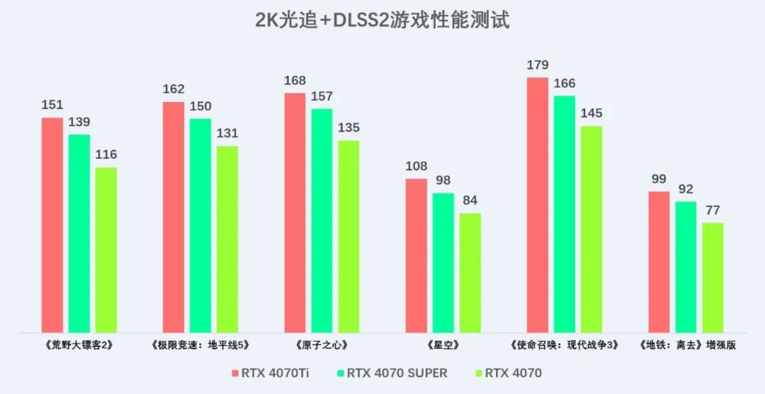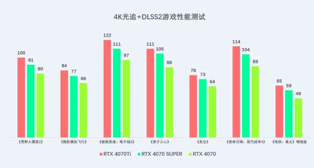 传统光栅游戏测试中,从测试成绩来看,在所测试的游戏中,不开启光追和DLSS的情况下,索泰 GEFORCE RTX 4070 SUPER在2K分辨下,帧数表现非常优异,以近乎80帧以上的帧数畅玩当下的3A游戏大作,就算在4K分辨率下,也有一战之力,除了2款游戏低于40帧外,其他的基本都能接近甚至超过60帧畅玩。