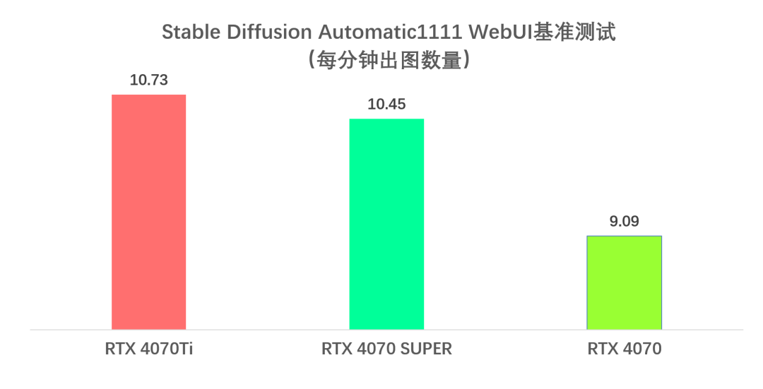 Stable Diffusion的基准测试结果来看,GEFORCE RTX 4070 SUPER每分钟出图数量达到10.45张,与GEFORCE RTX 4070 Ti的10.73张相差不多,而相较于比GEFORCE RTX 4070 AI绘图效率则提升了了约15%。