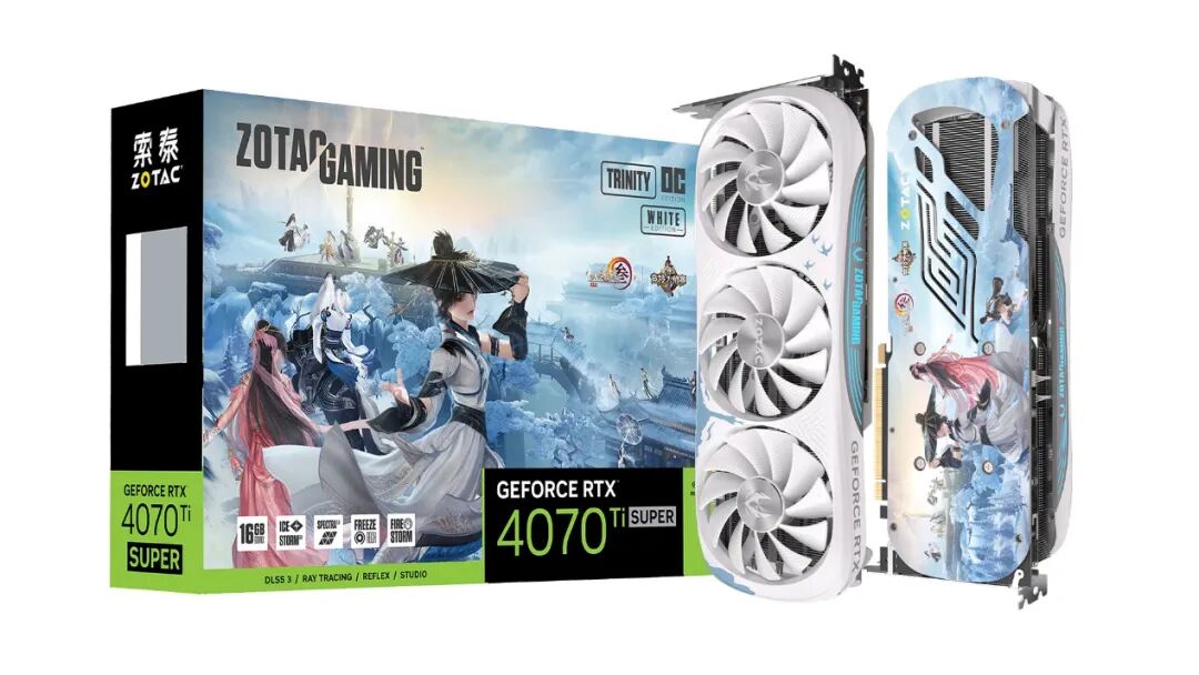索泰第九届《剑网3》竞技大师赛联名定制版显卡以索泰GeForce RTX 4070 Ti SUPER TRINITY OC 月白显卡作为设计蓝本,外观与赛事主视觉海报保持统一,打造出第九届《剑网3》竞技大师赛专属外观。