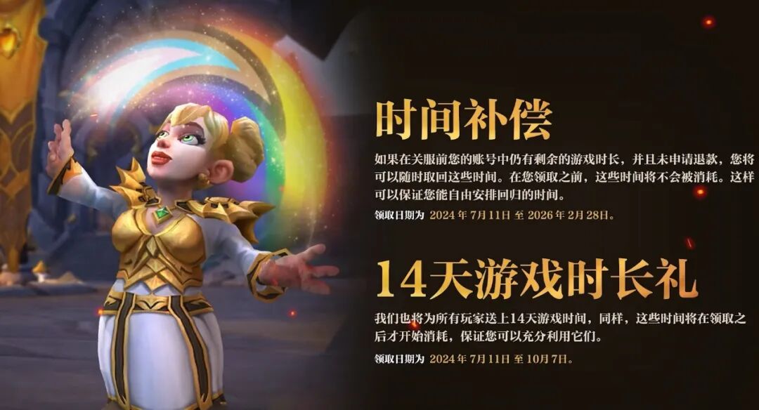 时间补偿就是玩家们在关服的时候账号内还剩下的游戏时长,将会补偿给玩家,同样是从玩家正式领取之后开始计算,领取时间会一直持续到2026年2月28日,也就是说,就算错过了首波开服,只要在领取时间结束前领取都可以补偿。