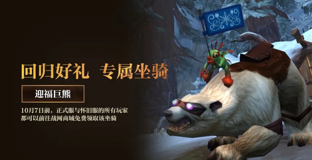 超稀有坐骑“暴雪巨熊”同模型的国服回归专属坐骑“迎福巨熊”,只有国服有,无论正式服还是怀旧服,上线免费送,还有比这更良心吗?