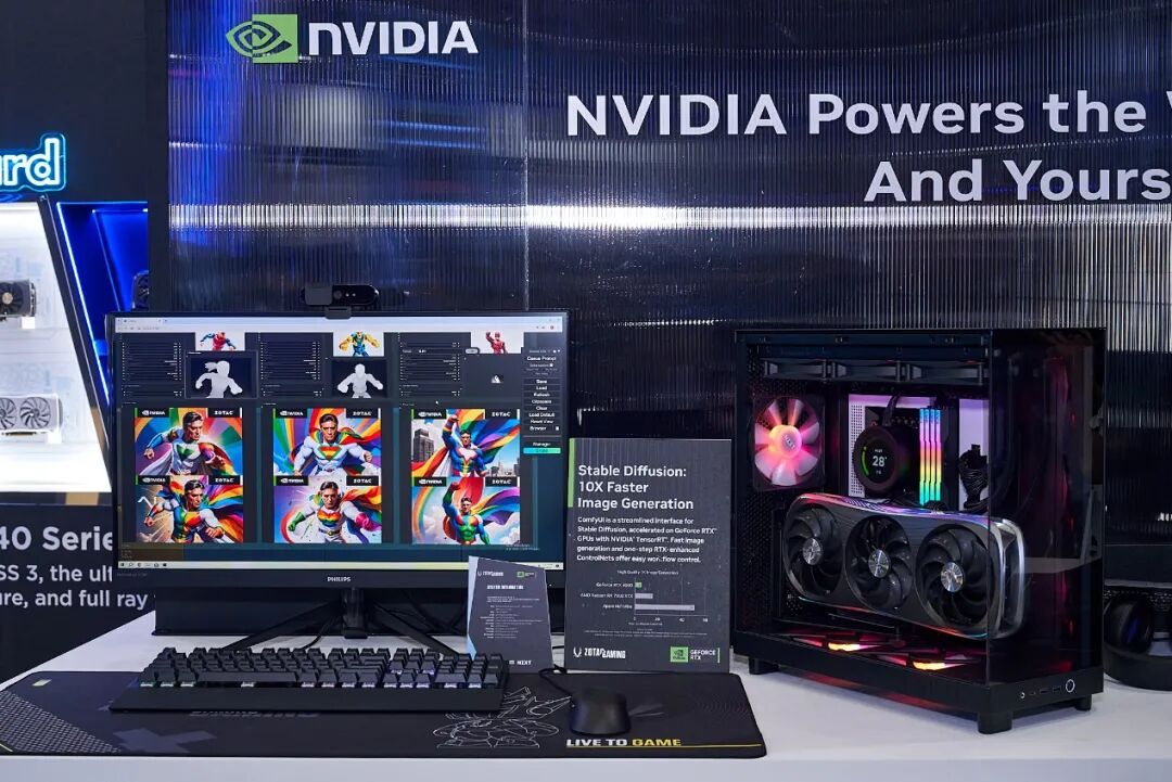 AI 正在推动各行各业的变革。从生成式 AI 和语音识别,到医学成像和改进的供应链管理,到更高清的游戏画面和帧数,人工智能的痕迹已逐渐渗透各行各业,可以毫不夸张地说:人工智能正在带来新的产业革命。索泰作为英伟达全球核心AIC合作伙伴,一直在持续拥抱AI技术,本次展会索泰特别设有NVIDIA RTX AI体验区,让与会者能切身感受AI对工作、游戏的超强加速。