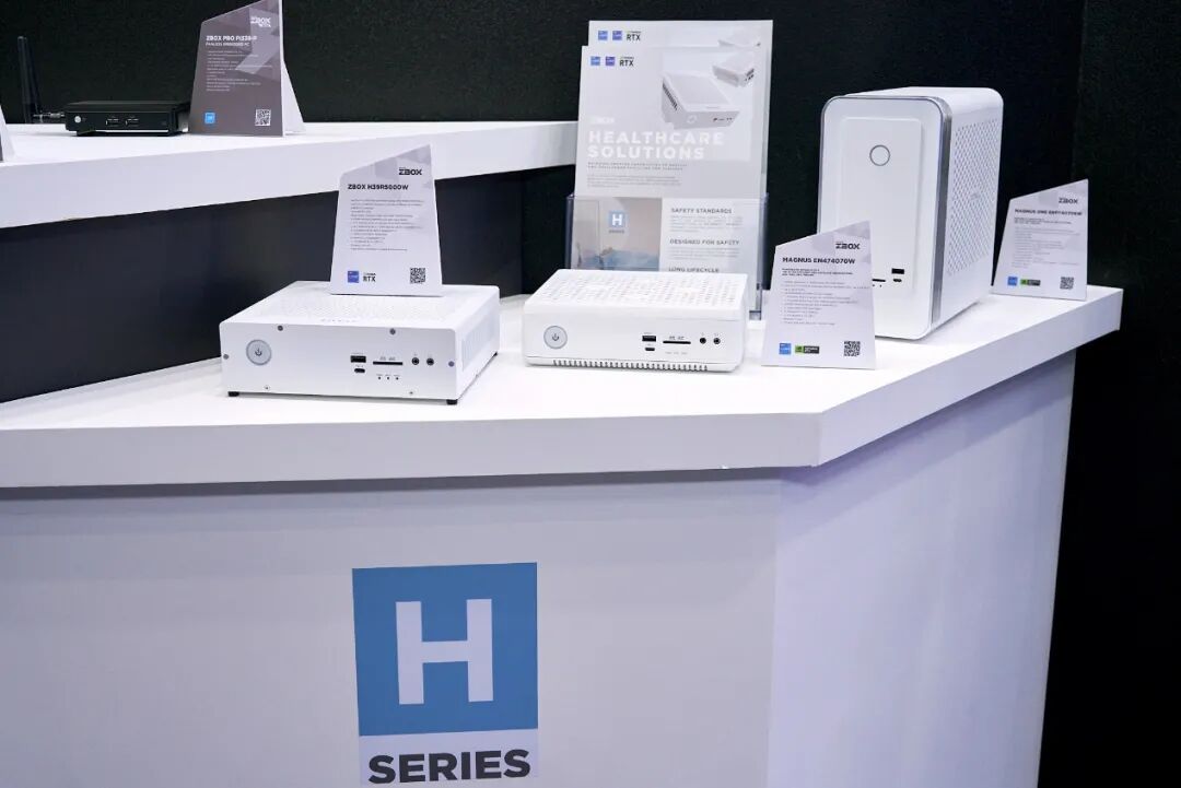 索泰此次还展出了最新推出的ZBOX Healthcare系列医用AI电脑,该系列配备NVIDIA RTX Ada Generation专业显卡和英特尔酷睿i9处理器,采用全白色机身,并通过了EN 60601-1医用电器设备标准,适用于医学成像、算法等领域。