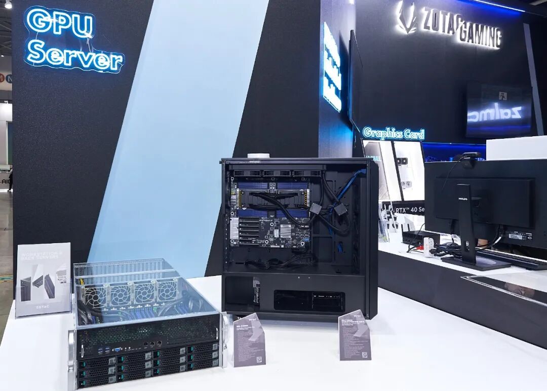 索泰新推出的GPU 服务器产品也在本次台北展阵容中亮相。其中包括 ZOTAC BOLT 塔式工作站系列,BOLT可容纳多达 2 个 GPU 和 2 个第五代英特尔至强处理器;以及索泰机架式服务器,可支持多达 10 个 GPU,用于人工智能培训和微调所需的高性能计算。