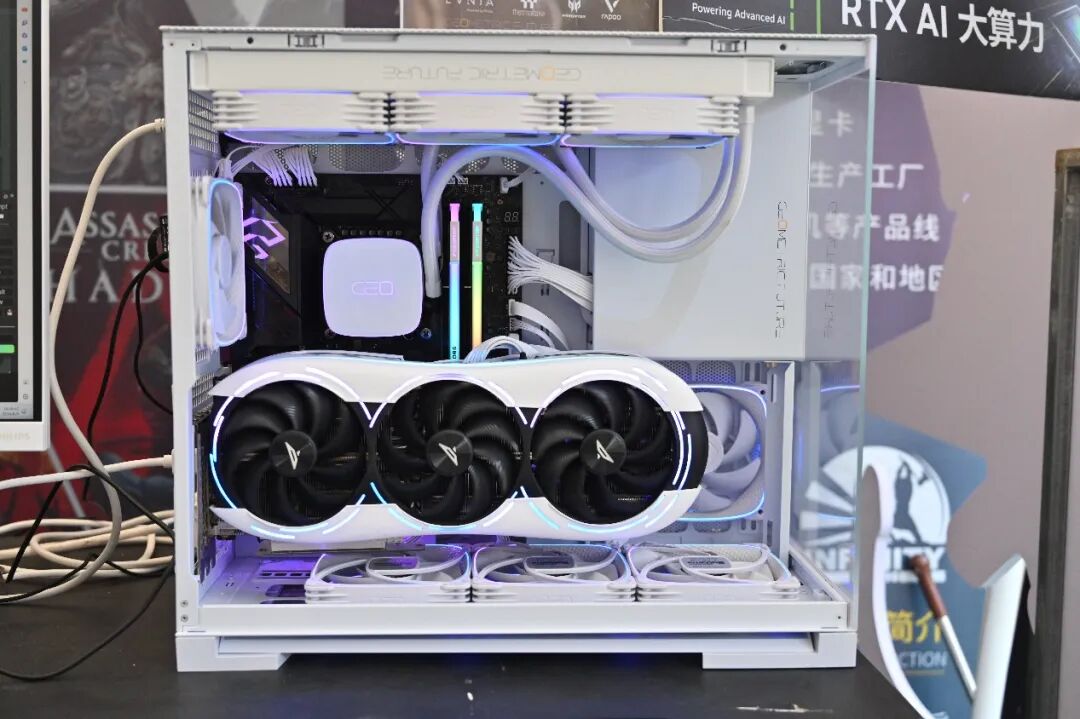 索泰展台的游戏体验区,这次准备了一台顶级性能的光追游戏整机,搭载了旗舰级的GeForce RTX 4090 D PGF显卡,当下最强的游戏和AI加速GPU,Ada Lovelace 全新架构,第3代 RT Core 核心,第四代 Tensor core,DLSS 3 帧生成,全景光线追踪,NVIDIA Reflex 电竞低延迟等游戏黑科技,为观众们带来了无与伦比的4K全景光线追踪游戏体验。