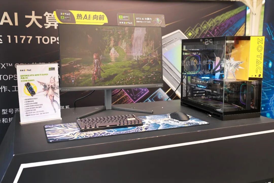 在AI体验区同样准备了一台高性能AI绘图专用RTX AI PC整机。搭载的是索泰GeForce RTX 4070 Ti SUPER 16GB 天启 OC,内置第4代Tensor core,拥有高达706 TOPS的AI算力,为AI绘图应用Stable Diffusion提供了强劲的性能保障。