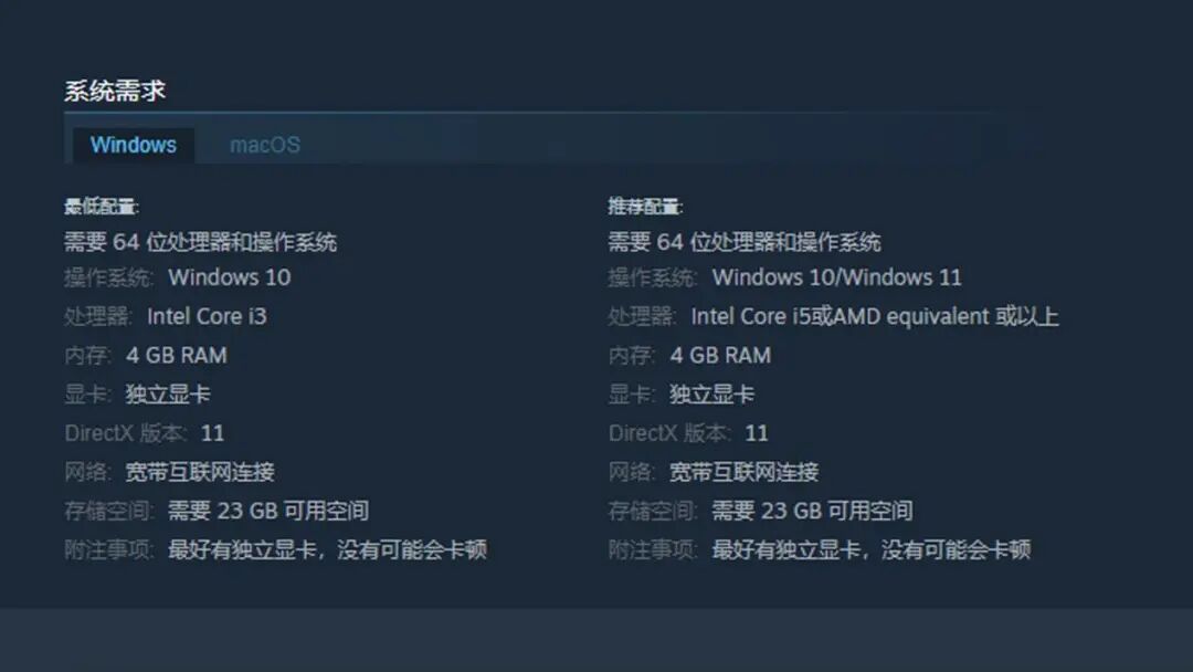从Steam上可以看到,虽然这部剧情类轻游戏对电脑配置的要求并不高,但官方还是推荐使用独立显卡进行游玩,否则可能会产生卡顿现象。